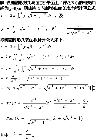 橢圓形封頭(x^2/a^2+y^2/c^2+z^2/c^2=1,c>a≥0,x≥0)表面積計(jì)算方法如下: